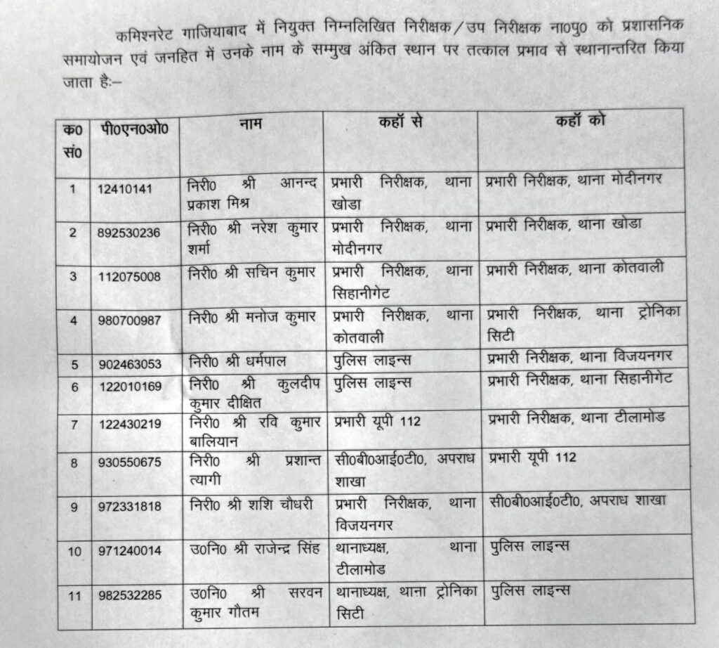 कानून व्यवस्था को और अधिक बेहतर बनाए जाने की दिशा में पुलिस विभाग में कोतवाली और थानाध्यक्षों के तबादले किये गए हैं। पुलिस कमिश्नर द्वारा गाजियाबाद जिले के पांच कोतवाली प्रभारी और 2 थानाध्यक्षों समेत 11 पुलिस कर्मियों के तबादले किये हैं। सभी को अपनी नवीन तैनाती पर तत्काल प्रभाव से ड्यूटी ज्वाइन करने के निर्देश दिये गए हैं। देखें सूची किसे कहां मिली नई तैनाती:—