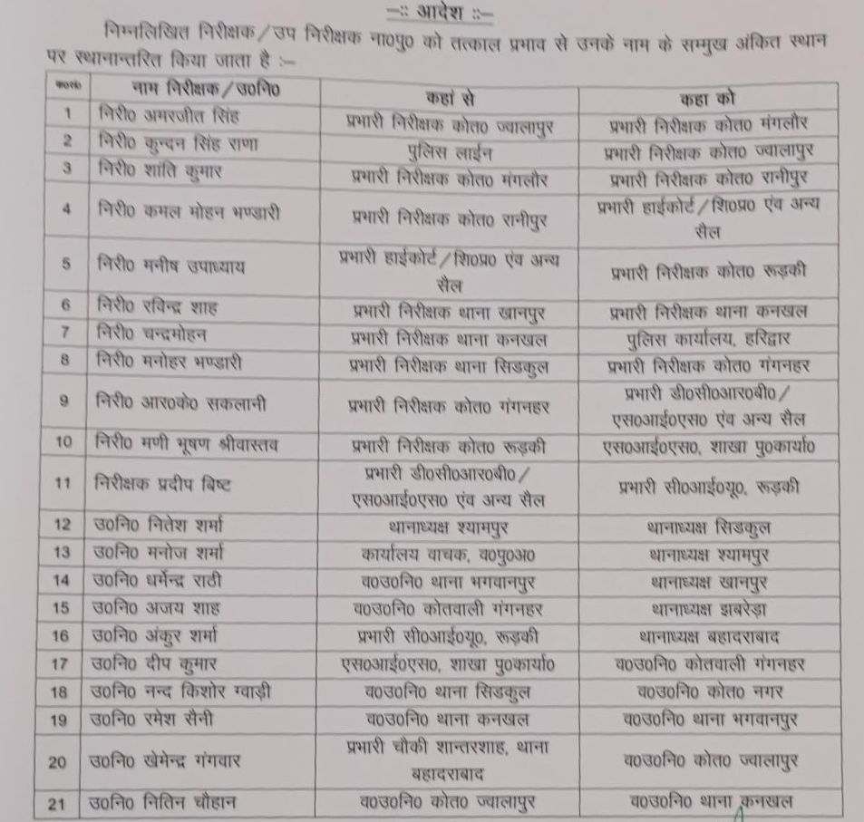 एसएसपी ने ​श्यामपुर थानाध्यक्ष नितेश शर्मा को सिडकुल थानाध्यक्ष बनाया गया है। प्रभारी निरीक्षक मंगलौर शांति कुमार को कोतवाली रानीपुर का प्रभारी निरीक्षक बनाया गया है। यहां प्रभारी रहे कमल मोहन भंडारी को प्रभारी हाईकोर्ट/शिकायत प्रकोष्ठ सैल का प्रभारी बनाया गया है। निरीक्षक मनीष उपाध्याय को प्रभारी निरीक्षक कोतवाली रुड़की की जिम्मेदारी दी गई है। निरीक्षक चंद्रमोहन को कनखल से हटाकर पुलिस कार्यालय हरिद्वार बुलाया गया है, उनके स्थान पर खानपुर प्रभारी रहे रविंद्र शाह को कनखल का प्रभारी बनाया गया है।