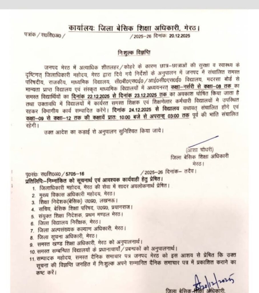 जिलाधिकारी मेरठ डॉक्टर वीके सिंह के आदेश पर भीषण ठंड व घने कोहरे के चलते नर्सरी से कक्षा 8 तक के सभी स्कूल 22 व 23 दिसंबर को बंद रहेंगे, जबकि 24 दिसंबर से विद्यालय सामान्य रूप से खुलेंगे। इस दौरान कक्षा 9 से 12 तक की पढ़ाई सुबह 10 बजे से दोपहर 3 बजे तक संचालित होगी। जिलाधिकारी के इस आदेश में सभी बोर्ड के स्कूल है शामिल।