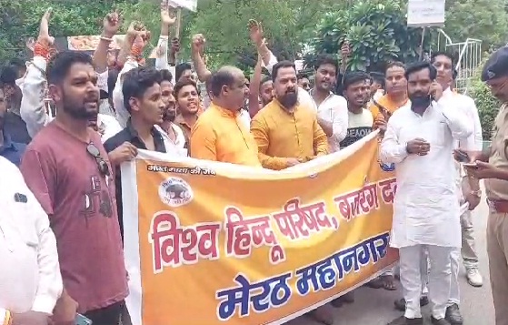 हरियाणा के नूंह में जलाभिषेक यात्रा पर हुए हमले की हिंसक घटना के बाद यूपी में भी अलर्ट किया गया है। मेरठ में बुधवार को विश्व हिंदू परिषद के आहृवान पर कार्यकर्ताओं ने जिला मुख्यालय पर प्रदर्शन किया।